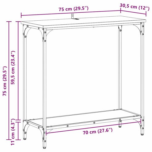 Dieser industrielle Konsolentisch verbindet cooles Design mit Funktionalität und ist perfekt für modernes Wohnen. Mit seinem robusten und stylischen Look gibt dieser schmale Tisch deinem Wohnzimmer oder Flur einen coolen Akzent. Die klaren Linien und die komplett schwarze Oberfläche machen ihn vielseitig und zu einem echten Blickfang, egal ob du Ausstellungen machst oder ihn zur Aufbewahrung in einem kleinen Raum nutzt. Ideal für schicke Wohnungen oder Häuser, seine Materialmischung und der schlichte Stil machen ihn zur klassischen Wahl. Materialien: Dieser Tisch ist aus robustem Holzwerkstoff gefertigt und sehr langlebig. Die glatte Oberfläche sieht stylisch aus und kann leicht abgewischt werden. Der Stahlrahmen kombiniert Stil und Stärke und bietet stabilen Halt für deine Deko. Enthaltene Komponenten: Der Konsolentisch hat stabile Regale, die viel Stauraum bieten. Sie sind perfekt für Bücher, Vasen oder Kunstwerke und setzen einen coolen Akzent. Die pulverbeschichtete Oberfläche macht ihn widerstandsfähig und sorgt dafür, dass er lange hält. Merkmale / Funktion / Design: Verstellbare Füße machen ihn ideal für unebene Böden und sorgen für Stabilität. Die schlanke rechteckige Form und die matte Oberfläche passen perfekt zu minimalistischer oder industrieller Einrichtung. Der Tisch kann viele verschiedene Zwecke erfüllen, was ihn zu einer tollen Ergänzung für jeden Raum macht. Empfohlene Verwendung: Super für Wohnzimmer oder Flure, sein platzsparendes Design bietet Raum, ohne den Stil zu verlieren. Er ist ideal, um deine Kreativität zu zeigen oder für die Ablage von Schlüsseln und anderen wichtigen Dingen, wenn du kommst und gehst, und bringt somit Bequemlichkeit in dein Zuhause. Pflege & Wartung: Ihn in Schuss zu halten ist einfach – einfach mit einem feuchten Tuch abwischen. Der Holzwerkstoff hält dem Alltag stand und sieht dabei immer stilvoll aus. ** Farbe: Altholz ** Material: Holzwerkstoff ** Oberfläche: Matt ** Gesamtabmessungen: 75 x 30.5 x 75 cm (B x T x H) ** Gewicht: 6 kg ** Verstellbare Füße ** Langlebig ** Sonstiges ** Mit regal ** Rahmenmaterial: Stahl ** Innen- / außenbereich: Nur für drinnen ** Lieferumfang: ** 1 x Konsolentisch ** Anzahl artikel: 1 ** Montage erforderlich: Ja