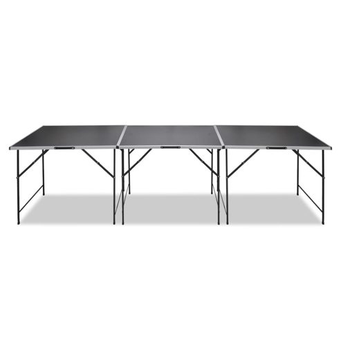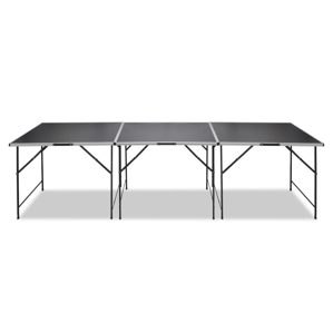 Dieses praktische 3-teilige Multifunktionstisch-Set ist flexibel, leicht und platzsparend. Er kann als Tapeziertisch, als Tisch für Ihren Marktstand, als Partytisch (für Essen, Getränke usw.) und auch als Arbeitstisch beim Heimwerken benutzt werden. Jeder Tisch der 3 Tische verfügt über einen Rahmen, der aus stabilem und leichtgewichtigem Aluminium hergestellt ist, und eine Arbeitsfläche aus robustem, pflegeleichten MDF. Unterstützt von robusten Eisenbeinen ist das Tisch-Set sehr stabil und langlebig. Mittels der im Lieferumfang befindlichen Klammern lassen sich die Tische miteinander stabil verbinden, sodass die Arbeitsfläche individuell verlängert werden kann. Dank des einfachen Klappsystems sind die Tische im Handumdrehen auf- und wieder abgebaut und können bei Nichtgebrauch am Tragegriff einfach transportiert werden. ** 3 Klapptische enthalten ** MDF-Tischplatte + Eisenbeine ** Maße (zusammengeklappt): 100 x 60 x 3 cm ** Maße (ausgeklappt): 100 x 60 x 82 cm ** Farbe: Schwarz ** Verbunden durch Klammern