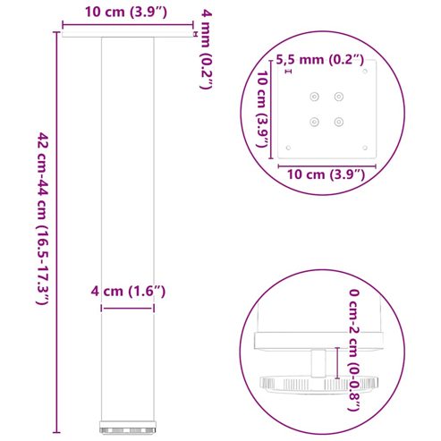Diese Couchtischbeine verbinden Form und Funktion. Sie sind die ideale Wahl, um deinen Couchtisch individuell zu gestalten. Langlebiges Material: Dieses Couchtischbein ist aus pulverbeschichtetem Stahl gefertigt und damit robust und langlebig genug, um eine schwere Tischplatte zu tragen.Praktisches Design: Dieses Couchtischbein ist mit verstellbaren Nivellierfüßen ausgestattet, die auch auf unebenen Böden für Stabilität sorgen und Bodenkratzer minimieren. Außerdem verfügt die Halterung über vorgebohrte Löcher und mitgelieferte Schrauben, mit denen das Bein an der Tischplatte befestigt werden kann (nicht im Lieferumfang enthalten), was die Montage erleichtert.Moderne Ästhetik: Das Bein des Couchtisches bietet ein schlichtes und modernes Aussehen. Seine klaren Linien und sein geometrisches Design werten das Gesamtbild des Möbels auf. Gut zu wissen:Die Lieferung umfasst nur die Tischbeine. Die Tischplatte ist nicht im Lieferumfang enthalten. ** Farbe: Naturstahl ** Material: Pulverbeschichteter Stahl ** Gesamthöhe: 42-44 cm ** Abmessungen der Röhre: 40 x 40 x 1,2 mm (L x B x T) ** Abmessungen der Halterung: 100 x 100 x 4 mm (L x B x T) ** Mit verstellbaren Kunststoffnivellierern ** Empfohlene Verwendung: Couchtisch, Bank ** ** Lieferung umfasst: ** 4 x Couchtischbein ** Schrauben (M5x18mm) zur Befestigung der Beine mit der Tischplatte