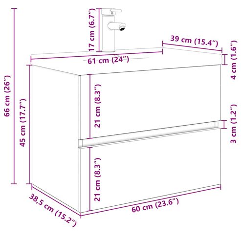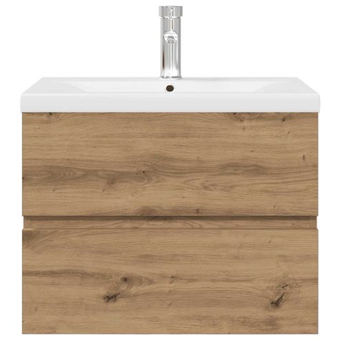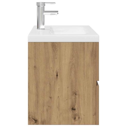 Dieser stilvolle Badezimmerschrank mit Einbaubecken und Wasserhahn bietet viel Stauraum und ist eine ausgezeichnete Ergänzung zu deinem Badezimmer, da er für Ordnung sorgt und eine markante Optik aufweist! Robustes Material: Der Unterschrank besteht aus Holzwerkstoff, einem Material von außergewöhnlicher Qualität mit glatter Oberfläche, das sich durch Festigkeit, Stabilität und Feuchtigkeitsbeständigkeit auszeichnet.Viel Stauraum: Der Waschbeckenunterschrank verfügt über eine Schublade und bietet dadurch viel Stauraum für die Aufbewahrung verschiedener Sachen in deinem Badezimmer.Praktisches Design: Auf der Oberseite dieses Badschranks findet dein Waschbecken den idealen Platz.Wandmontage: Der Badezimmerschrank lässt sich an der Wand montieren, um zusätzlichen Stauraum zu schaffen. Auf diese Weise kannst du deine Stellfläche maximieren und leichter für Ordnung sorgen.Überlauffunktion: Ein Überlauf sorgt dafür, dass das Wasser abfließt, wenn das Waschbecken zu voll wird. Gut zu wissen:Schrauben und Dübel für die Wandbefestigung sind nicht enthalten. Suchen und verwenden Sie die für Ihre Wände geeigneten Schrauben und Dübel. Wenn Sie unsicher sind, suchen Sie professionelle Hilfe. Lesen und befolgen Sie jeden Schritt der Anleitung sorgfältig.Wasserhahn und Ablauf mit Überlauffunktion sind im Lieferumfang enthalten.Es handelt sich um eine Warm- und Kaltwasser-Armatur. Für Warmwasser ist der Anschluss eines Warmwasserbereiters erforderlich. <ul>** Waschbeckenunterschrank: ** Farbe: Artisan-Eiche ** Material: Holzwerkstoff ** Abmessungen: 60 x 38,5 x 45 cm (B x T x H) ** Einbaubecken: ** Farbe: Weiß ** Material: Keramik ** Beckenmaße: 61 x 39 x 18 cm (L x B x H) ** Stärke der Keramikkante: 4 cm ** Abflussloch-Durchmesser: 4,5 cm ** Mit Überlauf ** Mit Wasserhahn ** Pop-Up-Ablauf mit Überlauf ** Zusammenbau erforderlich: Ja ** Lieferung umfasst: ** 1 x Waschbeckenunterschrank ** 1 x Einbaubecken mit Wasserhahn </ul> Kinder sollten beaufsichtigt werden, um sicherzustellen, dass sie nicht mit dem Gerät spielen. Halte Kinder vom Montagebereich fern. Achtung: Die Anweisungen vor der Verwendung sorgfältig durchlesen und zum späteren Nachschlagen aufbewahren.