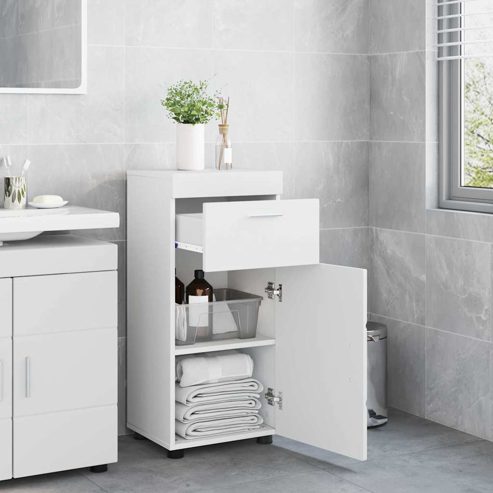 Mit diesem Badezimmer-Schrankset aus Holzwerkstoff bringst du moderne Eleganz in dein Bad. Die glatte Textur und das matte Finish machen das Set zu einem Blickfang mit klaren Linien und einer schicken, rechteckigen Form. Es ist perfekt für alle, die ihren Raum mit viel Stauraum aufwerten wollen, ohne auf ein ansprechendes Design zu verzichten. Es bietet eine einfache und smarte Lösung für die Organisation, die sich mühelos in moderne Badezimmer integriert. Materialien: Hergestellt aus hochwertigem Holzwerkstoff, kombiniert dieses Badezimmer-Schrankset Langlebigkeit mit Stil. Die Oberfläche hat einen zeitlosen Charme und ist sowohl praktisch als auch schön. Mit einer glatten, matten Fläche bleibt dein Bad immer frisch und ordentlich. Enthaltene Komponenten: Jedes Element des Sets wurde mit Blick auf Funktionalität entwickelt. Es hat geräumige Fächer und robuste Schubladen, die das Chaos in Ordnung bringen. Elektronische Teile sind inbegriffen, aber die Grundelemente bieten viel Stauraum. Merkmale / Funktion / Design: Dieses Schrankset verbindet modernes Design mit praktischen Funktionen. Ohne viel Schnickschnack wirkt es stilvoll und das matte Finish sorgt für einen eleganten Look. Es bietet viel Stauraum und ist dabei super anpassungsfähig. Empfohlene Verwendung: Ideal für Badezimmer, um Toilettenartikel, Handtücher und andere Essentials problemlos zu verstauen. Es fügt sich gut in verschiedene moderne Badezimmerstile ein und hebt jeden Raum hervor. Es ist besonders toll für Innenräume, die auf Effizienz setzen, denn es bietet funktionalen Stauraum. Pflege & Wartung: Die Pflege ist einfach – regelmässig mit einem feuchten Tuch abwischen reicht aus. Verwende keine aggressiven Reinigungsmittel, damit das matte Finish lange schön bleibt. Diese einfache Pflege ergänzt die robuste Verarbeitung und sorgt dafür, dass dein Schrank auch in Zukunft toll aussieht. ** Farbe: Weiß ** Material: Holzwerkstoff ** Oberfläche: Matt ** Gesamtabmessungen: 37 x 31.5 x 82 cm (L x B x H) ** Langlebig ** Reichlich Stauraum ** Mit tür ** Innen- / außenbereich: Nur für den innenbereich ** Lieferumfang: ** 1 x Badezimmer Schrank ** Montage erforderlich: Ja ** Sortimentsname: Tulum