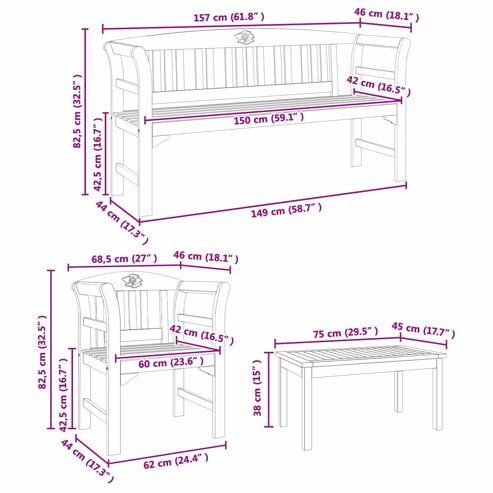 Dieses stylische Gartenmöbel-Set bringt Eleganz und Funktionalität in jeden Außenbereich. Mit seinen klaren Linien und dem minimalistischen Design fügt es sich nahtlos in verschiedene Gartenstile ein. Die stabile Konstruktion aus massivem Akazienholz sorgt dafür, dass das Set in jeder Saison top in Schuss bleibt. Der natürliche Braunton verleiht eine heimelige Atmosphäre. Ob du Gäste bewirtest oder einfach nur entspannst, dieses Set verwandelt deinen Garten oder deine Terrasse in eine moderne Oase. Massivholz Akazie: Komplett aus massivem Akazienholz gefertigt, bietet dieses Set Stabilität und Langlebigkeit. Das Holz ist witterungsbeständig, sodass die Möbel den Außeneinflüssen gut standhalten. Mit einer wasserfesten Abdeckung bleibt ihre Lebensdauer länger erhalten. Langlebiger Finish: Das geölte Finish unterstreicht die natürliche Holzfarbe und schützt es vor Feuchtigkeit. Es bewahrt nicht nur das ursprüngliche Aussehen, sondern sorgt auch dafür, dass das Set über Jahre hinweg schick bleibt. Funktionales Design: Die rechteckige Form macht das Set ideal für große Patios oder gemütliche Terrassen. Der minimalistische Look sorgt für eine entspannte Atmosphäre und passt perfekt in moderne Umgebungen. Komfortabel: Die stabilen Boxkissen bieten ergonomischen Komfort zur Entspannung. Die gut gestalteten Armlehnen und die bequeme Rückenlehne sorgen dafür, dass du es dir drinnen wie draußen richtig bequem machen kannst. Einfache Pflegeanleitung: Die Pflege geht ganz leicht – einfach mit einem trockenen Tuch abwischen, um die natürliche Schönheit zu erhalten. Setze die Möbel nicht übermäßigem Regen oder Sonne aus, wie empfohlen. ** Farbe: Natur ** Material: Massivholz Akazie ** Oberfläche: Geölt ** Gesamtabmessungen: 157 x 46 x 82,5 cm (L x B x H) ** Langlebig ** Sitzbereich: 42 x 60 cm (B x T) ** Rahmenmaterial: Massivholz Akazie ** Füllmaterial: Schaum ** Max. Gewicht: 110 kg pro Sitz ** Für Innen- und Außenbereich ** Lieferumfang: ** 2 x Stuhl: 62 x 46 x 82,5 cm (LxBxH) ** 1 x Bank: 157 x 46 x 82,5 cm (LxBxH) ** 1 x Tisch: 75 x 40 x 38 cm (LxBxH) ** Montage erforderlich: Ja