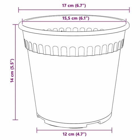 Dieses Set moderner Pflanzgefäße verbindet Eleganz und Charme mit einem minimalistischen Ansatz. Die zylindrische Form macht diese Kunststofftöpfe perfekt, um deinem Raum einen modernen Touch zu geben und Stil mit Funktionalität zu vereinen. Ihr schlankes Design passt zu vielen unterschiedlichen Umgebungen – ideal, um deinem Zuhause, Garten oder Balkon eine Portion Natur zu verleihen. Kunststoffzusammensetzung: Diese robusten und leichten Töpfe bestehen aus hochwertigem Kunststoff und sind eine langlebige Lösung für Pflanzgefäße. Sie halten verschiedenen Wetterbedingungen stand und sehen dabei immer gut aus und bieten deinen Pflanzen ein sicheres Zuhause. Durchdachte Designelemente: Mit den umgeschlagenen Kanten haben diese Töpfe einen modernen Look und eine praktische Handhabung. Das erleichtert das Umstellen, damit deine Pflanzen genügend Sonne bekommen und minimiert das Risiko von Schäden beim Transport. Effizientes Entwässerungssystem: Die Ablauflöcher im Boden verhindern Wasseransammlungen und sorgen für das optimale Wachstum deiner Pflanzen. So bleibt die Feuchtigkeit im idealen Bereich, was besonders wichtig in Außenbereichen ist, die von Regen betroffen sind. Ideal für verschiedene Räume: Diese Töpfe sind vielseitig einsetzbar, egal ob auf dem Balkon oder im Garten. Sie sind perfekt für Stadtbewohner, die ihren Balkon begrünen möchten, oder für Hausbesitzer, die entspannte Garten-Oasen schaffen wollen und dabei ein Gespür für Harmonie zeigen. Einfache Pflege: Die Reinigung der Töpfe erfordert nur wenig Aufwand – einfach abspülen reicht, um Staub oder Schmutz zu beseitigen. So bleiben sie über längere Zeit ansehnlich und pflegeleicht. ** Farbe: Schwarz ** Material: Kunststoff ** Gesamtabmessungen: 17 x 17 x 14 cm (L x B x H) ** Gewicht: 2,57 kg ** Langlebig ** Leichtes Gewicht ** Gerollter Rand ** Entwässerungslöcher am Boden ** Einfach zu reinigen ** Für Innen- und Außenbereich ** Lieferumfang: ** 24 x Pflanzenübertöpfe