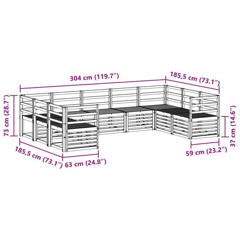 Das Möbelset für draußen vereint Style und Nutzen und wird der Hauptanziehungspunkt in jedem Garten oder auf jeder Terrasse. Mit seinem modernen Look, der von klaren Linien und minimalistischen Details geprägt ist, strahlt es Eleganz aus und sorgt für eine gemütliche Atmosphäre im Freien bei geselligen Treffen. Komplett aus massivem Akazienholz, garantiert das Set Haltbarkeit und einen ansprechenden Look, also die perfekte Wahl für alle, die praktische und schicke Gartenmöbel suchen. Langlebiges massives Akazienholz: Dieses Outdoor-Möbelset ist aus massivem Akazienholz und bekannt für seine Widerstandsfähigkeit gegenüber Witterung. Die robuste Bauweise bietet dir langanhaltende Stabilität, während der warme natürliche Farbton jede Gartengestaltung aufwertet. Wetterfestes Design: Das Möbelset hat eine lackierte Oberfläche, die es zusätzlich gegen Sonne, leichten Regen und andere Witterungseinflüsse schützt. Das glatte Finish hilft, sowohl das Aussehen als auch die Funktion zu erhalten und sorgt dafür, dass es lange bei dir bleibt. Komponenten & Design: Jedes Stück, von den Armlehnen bis zu den Rückenlehnen, ist für Style und Funktionalität gemacht. Durchdachte Details sorgen für zusätzlichen Komfort, während das schöne Design ein ansprechendes Gesamtbild für deinen Außenbereich schafft. Komfort & Vielseitigkeit: Das modulare Design erlaubt dir, die Anordnung flexibel zu gestalten. Egal, ob zum Entspannen, für gesellige Abende oder ruhige Lesemomente, dieses Set passt sich mühelos an jede Umgebung an. Einfache Pflege & Wartung: Um die Möbel gut zu halten, wisch einfach die Oberfläche mit einem feuchten Tuch ab und vermeide aggressive Reiniger. Regelmäßige Pflege hilft, das Aussehen zu bewahren und verlängert die Lebensdauer. ** Farbe: Natur ** Material: Massivholz Akazie ** Gesamtabmessungen: 304 x 185,5 x 73 cm (L x B x H) ** Gewicht: 39,58 kg ** Langlebig ** Einfach zu pflegen ** Latten-Design ** Naturholzstruktur ** Armlehnenhöhe vom Sitz aus: 36 cm ** Max. Gewicht: 110 kg pro Sitz ** Nur für den Außenbereich ** Lieferumfang: ** 2 x Ecksofa: 63 x 63 x 73 cm (L x B x H) ** 7 x Mittelsitz: 63 x 59 x 73 cm (L x B x H) ** 2 x Armlehne: 59 x 4 x 73 cm (L x B x H) ** Montage erforderlich: Ja