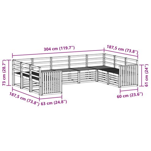 Das Möbelset für draußen vereint Style und Nutzen und wird der Hauptanziehungspunkt in jedem Garten oder auf jeder Terrasse. Mit seinem modernen Look, der von klaren Linien und minimalistischen Details geprägt ist, strahlt es Eleganz aus und sorgt für eine gemütliche Atmosphäre im Freien bei geselligen Treffen. Komplett aus massivem Akazienholz, garantiert das Set Haltbarkeit und einen ansprechenden Look, also die perfekte Wahl für alle, die praktische und schicke Gartenmöbel suchen. Langlebiges massives Akazienholz: Dieses Outdoor-Möbelset ist aus massivem Akazienholz und bekannt für seine Widerstandsfähigkeit gegenüber Witterung. Die robuste Bauweise bietet dir langanhaltende Stabilität, während der warme natürliche Farbton jede Gartengestaltung aufwertet. Wetterfestes Design: Das Möbelset hat eine lackierte Oberfläche, die es zusätzlich gegen Sonne, leichten Regen und andere Witterungseinflüsse schützt. Das glatte Finish hilft, sowohl das Aussehen als auch die Funktion zu erhalten und sorgt dafür, dass es lange bei dir bleibt. Komponenten & Design: Jedes Stück, von den Armlehnen bis zu den Rückenlehnen, ist für Style und Funktionalität gemacht. Durchdachte Details sorgen für zusätzlichen Komfort, während das schöne Design ein ansprechendes Gesamtbild für deinen Außenbereich schafft. Komfort & Vielseitigkeit: Das modulare Design erlaubt dir, die Anordnung flexibel zu gestalten. Egal, ob zum Entspannen, für gesellige Abende oder ruhige Lesemomente, dieses Set passt sich mühelos an jede Umgebung an. Einfache Pflege & Wartung: Um die Möbel gut zu halten, wisch einfach die Oberfläche mit einem feuchten Tuch ab und vermeide aggressive Reiniger. Regelmäßige Pflege hilft, das Aussehen zu bewahren und verlängert die Lebensdauer. ** Farbe: Natur ** Material: Massivholz Akazie ** Gesamtabmessungen: 304 x 187,5 x 73 cm (L x B x H) ** Gewicht: 40,9 kg ** Langlebig ** Einfach zu pflegen ** Latten-Design ** Naturholzstruktur ** Armlehnenhöhe vom Sitz aus: 24 cm ** Max. Gewicht: 110 kg pro Sitz ** Nur für den Außenbereich ** Lieferumfang: ** 2 x Ecksofa: 63 x 63 x 73 cm (L x B x H) ** 7 x Mittelsitz: 63 x 59 x 73 cm (L x B x H) ** 2 x Armlehne: 60 x 6 x 61 cm (L x B x H) ** Montage erforderlich: Ja