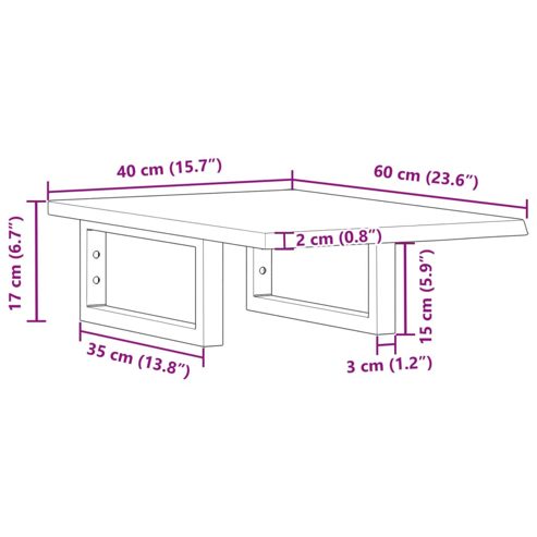 Das Regal lässt sich sicher an der Wand befestigen und bietet eine elegante und platzsparende Lösung für dein Badezimmer. Robust und langlebig: Diese Waschtisch-Platte hat Stahlhalterungen und eine Eichenholz-Platte, wodurch sie robust, stabil und langlebig ist.Platzsparend: Das Schweberegal bietet reichlich Platz für Cremes und verschiedene Kleinigkeiten. Dank der rechteckigen Form der Halterungen kannst du auch Handtücher oder andere Sachen darauf platzsparend aufhängen.Einfache Verwendung: Die Holzplatte ist nicht vorgebohrt, sodass dein Waschbecken je nach Bedarf links, rechts oder in der Mitte angebracht werden kann. Dank der vorgebohrten Löcher in der Halterung lässt sich die Ablage am Waschtisch oder an der Wand mühelos befestigen.Vielseitig einsetzbar: Dank ihres modernen Designs schafft die Ablage zusätzlichen Stauraum und fügt sich harmonisch in die unterschiedlichsten Einrichtungen ein. Gut zu wissen:Die Schrauben sind nicht im Lieferumfang enthalten. Du kannst die Schrauben anhand von den folgenden Informationen separat erwerben.Wandbefestigung: 2 x M8-Dehnschraube pro HalterungHolzplatte: 2 x M5x18-Schraube (T=2) oder 2 x M5x20-Schraube (T=2,5/4 cm) pro HalterungAls Naturprodukt kann Holz Aststellen und Unebenheiten aufweisen, die wir mit schwarzer Füllung ausfüllen, um ein glattes Aussehen zu gewährleisten. ** Oberplatte: ** Material: Massives Eichenholz (unbehandelt) ** Abmessungen: 40 x 60 x 2 cm (L x B x T) ** Halterung: ** Farbe: Schwarz ** Material: Stahl ** Größe der Halterung: 15 x 35 cm (B x L) ** Rohrgröße: 3 x 3 cm (B x L) ** Form: Rechteckig ** Belastbarkeit: 100 kg ** Abstand der Wandbefestigungslöcher: 60 mm ** Der Abstand zwischen Tischplattenbohrung und Tischkante beträgt 60 mm zu jeder Seite ** Mit 2 Löchern für die Wandmontage und 2 Löchern für die Tischmontage ** Schrauben sind nicht im Lieferumfang enthalten ** Zusammenbau erforderlich: Ja ** Lieferung umfasst: ** 1 x Tischplatte ** 2 x Halterungen für Waschtische