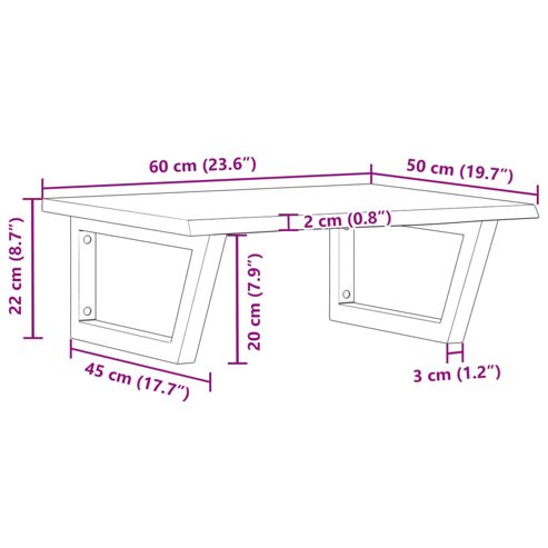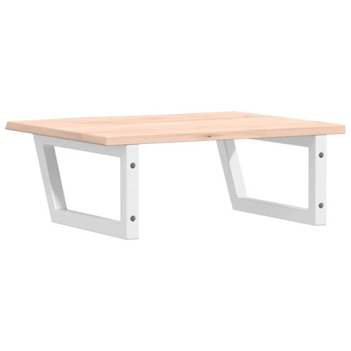 Das Regal lässt sich sicher an der Wand befestigen und bietet eine elegante und platzsparende Lösung für dein Badezimmer. Robust und langlebig: Diese Waschtisch-Platte hat Stahlhalterungen und eine Eichenholz-Platte, wodurch sie robust, stabil und langlebig ist.Platzsparend: Das Schweberegal bietet reichlich Platz für Cremes und Kleinigkeiten. Dank der Trapezform der Halterungen lassen sich auch Handtücher oder andere Sachen platzsparend darauf aufhängen.Einfache Verwendung: Die Holzplatte ist nicht vorgebohrt, sodass dein Waschbecken je nach Bedarf links, rechts oder in der Mitte angebracht werden kann. Dank der vorgebohrten Löcher in der Halterung lässt sich die Ablage am Waschtisch oder an der Wand mühelos befestigen.Vielseitig einsetzbar: Dank ihres modernen Designs schafft die Ablage zusätzlichen Stauraum und fügt sich harmonisch in die unterschiedlichsten Einrichtungen ein. Gut zu wissen:Die Schrauben sind nicht im Lieferumfang enthalten. Du kannst die Schrauben anhand von den folgenden Informationen separat erwerben.Wandbefestigung: 2 x M8-Dehnschraube pro HalterungHolzplatte: 2 x M5x18-Schraube (T=2) oder 2 x M5x20-Schraube (T=2,5/4 cm) pro HalterungAls Naturprodukt kann Holz Aststellen und Unebenheiten aufweisen, die wir mit schwarzer Füllung ausfüllen, um ein glattes Aussehen zu gewährleisten. ** Oberplatte: ** Material: Massives Eichenholz (unbehandelt) ** Abmessungen: 60 x 50 x 2 cm (L x B x T) ** Halterung: ** Farbe: Weiß ** Material: Stahl ** Größe der Halterung: 20 x 45 cm (B x L) ** Rohrgröße: 3 x 3 cm (B x L) ** Form: Trapez ** Belastbarkeit: 100 kg ** Abstand der Wandbefestigungslöcher: 60 mm ** Der Abstand zwischen Tischplattenbohrung und Tischkante beträgt 100 mm zu jeder Seite ** Mit 2 Löchern für die Wandmontage und 2 Löchern für die Tischmontage ** Schrauben sind nicht im Lieferumfang enthalten ** Zusammenbau erforderlich: Ja ** Lieferung umfasst: ** 1 x Tischplatte ** 2 x Halterungen für Waschtische