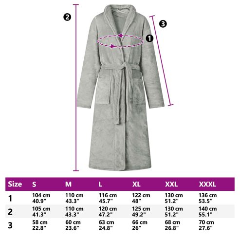 Dieser Bademantel ohne Kapuze bietet dir ultimative Wärme und Entspannung in der kalten Winterzeit. Er ist perfekt für drinnen und umhüllt dich mit seinem flauschigen, weichen Material, was ihn zum idealen Begleiter für faule Morgende oder gemütliche Abende macht. Das schlichte, aber schicke Design fügt sich nahtlos in jedes Schlafzimmer oder Wohnzimmer ein, verbessert Stil und Komfort. Erlebe die perfekte Kombination aus Luxus und Alltagstauglichkeit mit diesem unverzichtbaren Teil der Lounge-Bekleidung. Weiches Flanellmaterial Der Bademantel ist aus hochwertigem Flanell, das für seine flauschige Textur bekannt ist. Dieses Material bietet Wärme und einen sanften Touch auf der Haut, perfekt für den Winter drinnen. Es sorgt für ein kuscheliges Erlebnis in deinem Schlafzimmer oder Wohnzimmer. Praktische Aufbewahrungstasche Dieser Bademantel hat eine praktische Tasche, die mehr Komfort bietet. Sie ist ideal für kleine Dinge wie dein Handy oder zur Wärme deiner Hände. Die Tasche ist stylish und stört das Gesamtbild nicht. Leicht und tragbar Mit diesem leichten Bademantel kannst du dich frei bewegen. Egal ob auf der Couch oder im ganzen Haus, sein Design hält dich bequem und beweglich. Zudem passt er super in deine Wochenendtasche. Saisonale Winterkleidung Speziell für die kalte Jahreszeit gemacht, ist dieser Bademantel ideal und kombiniert Wärme mit Stil. Seine sanfte Farbe und das minimalistische Design passen in jeden Wohnstil und halten dich zugleich chic und gemütlich. Pflege & Wartung Um das tolle Gefühl zu behalten, ist der Bademantel pflegeleicht. Maschinenwaschbar, beachte die Pflegeanleitung und vermeide Bleichmittel, um die Weichheit und Farbe zu bewahren. Die Langlebigkeit sorgt dafür, dass er viele Saisons ein treuer Begleiter bleibt. ** Farbe: Grau ** Material: Flanell ** Gesamtabmessungen: 130 x 130 cm (L x B) ** Gewicht: 0,79 kg ** Leichtes Gewicht ** Tragbar ** Langlebig ** Praktische Taschen ** Einfache Pflege ** Innen- / Außenbereich: Nur für den Innenbereich ** Lieferumfang: ** 1 x Bademantel ohne Kapuze