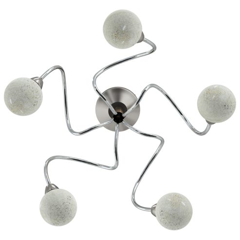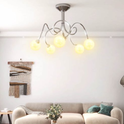Diese einzigartige Deckenleuchte mit 5 runden Glasschirmen besticht durch ihr modernes Design und verleiht deinem Raum einen atemberaubenden Look. Verchromtes Material: Der gesamte Stahlsockel und die 5 verschlungenen Stahlrohre sind verchromt, sodass die Deckenleuchte auf eine lange Lebensdauer ausgelegt ist. Zudem sparst du so Zeit und Geld beim Wechseln der Lampe.G9-Fassung: Die elegante Deckenlampe ist mit 5 G9-Fassungen ausgestattet, wobei die maximale Wattzahl jeder Birne 40 Watt nicht überschreiten darf.LED-Leuchte: Durch die energiesparende LED-Technologie werden der Energieverbrauch und die Stromkosten verringert.Schöne Lampenschirme: Durch die zarten Glasschirme durchscheint wunderbares Licht, das jeden Winkel des Raumes beleuchtet. Hinweis:Zur einfachen Montage und Bedienung wird jedes Produkt mit einer Bedienungsanleitung in der Box geliefert. ** Farbe des Lampenschirms: Transparent ** Material: Stahl mit Chrombeschichtung, Glas ** Abmessungen: 52 x 34 cm (Durchmesser x H) ** Durchmesser des Lampenschirms: 8 cm ** Stromspannung 220-240V~ ** Frequenz: 50Hz ** Max. Leistung: 5 × 40 W ** Lampenfassung: G9 ** Lieferung umfasst: ** 1 x Deckenleuchte ** 5 x LED-Leuchtmittel Dieses Gerät ist nicht dafür bestimmt, von Personen (einschließlich Kindern) mit eingeschränkten physischen, sensorischen oder geistigen Fähigkeiten oder mangelnder Erfahrung und mangelndem Wissen benutzt zu werden, es sei denn, sie werden von einer für ihre Sicherheit verantwortlichen Person beaufsichtigt oder in der Benutzung des Geräts unterwiesen. Dieses Produkt ist kein Spielzeug. Erlaube Kindern nicht, mit dem Gerät zu spielen.