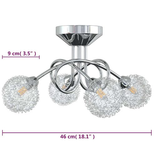 Diese einzigartige Deckenleuchte mit 4 Glasschirmen, die mit einem Drahtgeflecht aus Aluminium umwickelt sind, besticht durch ihr modernes Design und verleiht deinem Raum einen atemberaubenden Look. Verchromtes Material: Der gesamte Stahlsockel und die 4 verschlungenen Stahlrohre sind verchromt, sodass die Deckenleuchte auf eine lange Lebensdauer ausgelegt ist. Zudem sparst du so Zeit und Geld beim Wechseln der Lampe.G9-Fassung: Die elegante Deckenlampe ist mit 4 G9-Fassungen ausgestattet, wobei die maximale Wattzahl jeder Birne 40 Watt nicht überschreiten darf.LED-Leuchte: Durch die energiesparende LED-Technologie werden der Energieverbrauch und die Stromkosten verringert.Schöne Lampenschirme: Durch die filigranen Glasschirme durchscheint wunderbares Licht, das jeden Winkel des Raumes beleuchtet. Das Drahtgeflecht aus Aluminium lässt das Licht noch heller leuchten. Hinweis:Jedes Produkt wird mit einer Montageanleitung in der Verpackung für eine einfache Montage geliefert. ** Farbe des Lampenschirms: Transparent ** Material: Stahl mit Chrombeschichtung, Glas, Aluminium ** Abmessungen: 46 x 20 cm (Durchmesser x H) ** Lampshade Durchmesser: 9 cm ** Stromspannung 220-240V~ ** Frequenz: 50Hz ** Max. Leistung: 4 × 40 W ** Lampenfassung: G9 ** Lieferung umfasst: ** 1 x Deckenleuchte ** 4 x LED-Lampen Dieses Gerät ist nicht dafür bestimmt, von Personen (einschließlich Kindern) mit eingeschränkten physischen, sensorischen oder geistigen Fähigkeiten oder mangelnder Erfahrung und mangelndem Wissen benutzt zu werden, es sei denn, sie werden von einer für ihre Sicherheit verantwortlichen Person beaufsichtigt oder in der Benutzung des Geräts unterwiesen. Dieses Produkt ist kein Spielzeug. Erlaube Kindern nicht, mit dem Gerät zu spielen.