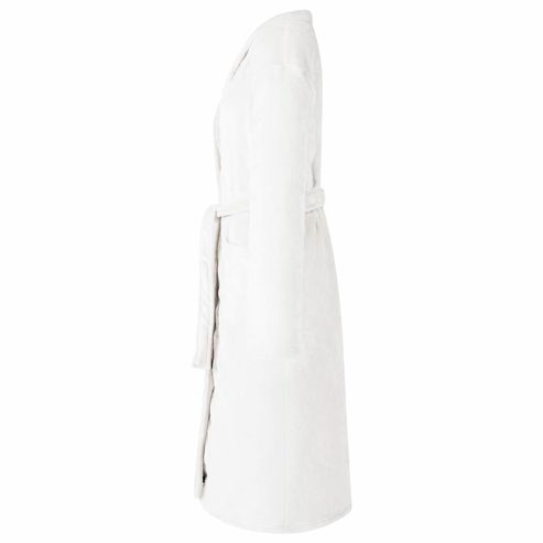 Dieser Bademantel ohne Kapuze bietet dir ultimative Wärme und Entspannung in der kalten Winterzeit. Er ist perfekt für drinnen und umhüllt dich mit seinem flauschigen, weichen Material, was ihn zum idealen Begleiter für faule Morgende oder gemütliche Abende macht. Das schlichte, aber schicke Design fügt sich nahtlos in jedes Schlafzimmer oder Wohnzimmer ein, verbessert Stil und Komfort. Erlebe die perfekte Kombination aus Luxus und Alltagstauglichkeit mit diesem unverzichtbaren Teil der Lounge-Bekleidung. Weiches Flanellmaterial Der Bademantel ist aus hochwertigem Flanell, das für seine flauschige Textur bekannt ist. Dieses Material bietet Wärme und einen sanften Touch auf der Haut, perfekt für den Winter drinnen. Es sorgt für ein kuscheliges Erlebnis in deinem Schlafzimmer oder Wohnzimmer. Praktische Aufbewahrungstasche Dieser Bademantel hat eine praktische Tasche, die mehr Komfort bietet. Sie ist ideal für kleine Dinge wie dein Handy oder zur Wärme deiner Hände. Die Tasche ist stylish und stört das Gesamtbild nicht. Leicht und tragbar Mit diesem leichten Bademantel kannst du dich frei bewegen. Egal ob auf der Couch oder im ganzen Haus, sein Design hält dich bequem und beweglich. Zudem passt er super in deine Wochenendtasche. Saisonale Winterkleidung Speziell für die kalte Jahreszeit gemacht, ist dieser Bademantel ideal und kombiniert Wärme mit Stil. Seine sanfte Farbe und das minimalistische Design passen in jeden Wohnstil und halten dich zugleich chic und gemütlich. Pflege & Wartung Um das tolle Gefühl zu behalten, ist der Bademantel pflegeleicht. Maschinenwaschbar, beachte die Pflegeanleitung und vermeide Bleichmittel, um die Weichheit und Farbe zu bewahren. Die Langlebigkeit sorgt dafür, dass er viele Saisons ein treuer Begleiter bleibt. ** Farbe: Weiß ** Material: Flanell ** Gesamtabmessungen: 125 x 64 cm (L x B) ** Gewicht: 0,84 kg ** Leichtes Gewicht ** Tragbar ** Langlebig ** Praktische Taschen ** Einfache Pflege ** Innen- / Außenbereich: Nur für den Innenbereich ** Lieferumfang: ** 1 x Bademantel ohne Kapuze