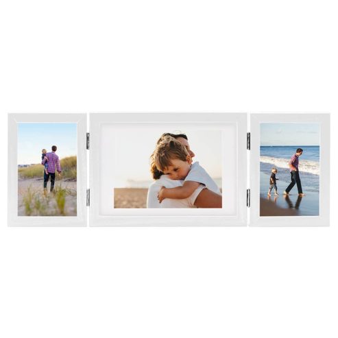 Stellen Sie Ihre schönsten Momente mit diesem trendigen Dreifach-Bilderrahmen zur Schau. Ihre Erinnerungen werden stilvoll präsentiert und ein echter Hingucker sein. Der aufklappbare Bilderrahmen kennzeichnet sich durch klassische gerade Linien und verleiht Ihrem Wohnraum eine lebendige und moderne Note. Die MDF-Platte an der Rückseite und das harte PS-Material an der Vorderseite bieten optimalen Schutz. Dank der Verriegelung auf der Rückseite können Sie Ihre Bilder ganz einfach austauschen. Durch sein Klappdesign kann dieser Fotorahmen ohne Ständer auf dem Tisch stehen. ** Farbe: Weiß ** Material: MDF, PS (Polystyrol) ** Größe des großen Rahmens: 22 x 15 cm (B x H) ** Größe des kleinen Rahmens: 10 x 15 cm (B x H) ** Rückwandstärke: 2 mm ** Passende Bildgröße für den großen Rahmen: 13 x 18 cm (B x H) ** Klappbares Design ** Verfügt über Scharniere zwischen den Rahmen ** Kann ohne Ständer auf den Tisch gestellt werden ** Kann leicht geöffnet werden, um jederzeit ein Bild hinzuzufügen
