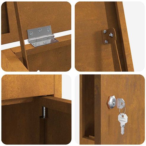 Diese Outdoor-Paketdropbox ist eine moderne Lösung, um Pakete sicher an jedem Außenstandort zu empfangen, und kombiniert Funktionalität mit Stil. Ihre klaren, geometrischen Linien verkörpern Einfachheit und sorgen gleichzeitig mit ihrem abschließbaren Mechanismus für Sicherheit. Entworfen für den Wohn- oder Geschäftsbereich bietet sie eine praktische Möglichkeit, Pakete Tag und Nacht zu empfangen, wodurch das Risiko von Diebstahl und Verlegung verringert wird. Dieses Stück ist vielseitig, mit einer eleganten Ästhetik, die sich in verschiedene Architekturstile in Gärten und auf Terrassen einfügt. Robuste Konstruktion: Hergestellt aus wasserabweisenden Materialien, hält dieser Paketbriefkasten den Witterungen stand und sorgt dafür, dass die Pakete trocken und unversehrt bleiben. Speziell für den Außenbereich entworfen, weist das Material Feuchtigkeit ab und bietet dauerhaften Schutz und erhält seine Qualität und sein Aussehen durch wechselnde Jahreszeiten. Sichere Paketlagerung: Mit einem robusten abschließbaren Mechanismus bietet dieser Briefkasten Seelenfrieden, indem er Pakete sicher aufbewahrt, bis du sie abholst. Das Schloss ist einfach zu bedienen und bietet eine zusätzliche Sicherheitsebene gegen unbefugten Zugriff, wodurch es sich für den Einsatz in offenen Umgebungen eignet. Effiziente Paketzugänglichkeit: Sein benutzerfreundliches Design ermöglicht ein praktisches Abgeben und Abrufen von Paketen, wodurch die Benutzerfreundlichkeit für verschiedene Paketgrößen gewährleistet ist. Das intuitive Zugangstürdesign ist für häufige Nutzung geeignet und sorgt dafür, dass Kuriere und Empfänger minimalen Aufwand haben. Anpassungsfähiger Stil: Mit einem minimalistischem Stil, der durch moderne Linien geprägt ist, fügt sich dieser Paketbriefkasten mühelos in die meisten Außenbereiche ein. Seine Vielseitigkeit erlaubt es ihm, eine breite Palette von Dekoren zu ergänzen und verleiht Mehrfamilienhäusern, Wohnungen oder Gartenbereichen einen Hauch von Eleganz. Sicherheit zuerst bei der Montage: Die Installation erfordert eine sichere Befestigung an einer Wand, wie beschrieben, um ein Umkippen zu verhindern und Stabilität zu gewährleisten. Dieser Schritt sorgt dafür, dass die Paketdropbox sicher an ihrem Platz bleibt und langfristigen zuverlässigen Gebrauch und Sicherheit bietet. Die Einhaltung der Montage- und Pflegeanweisungen erhält die Integrität der Box im Laufe der Zeit. ** Farbe: Rostig ** Material: Witterungsbeständiger stahl ** Beenden: Other ** Gesamtabmessungen: 44.5 x 29 x 110.5 cm (W x L x H) ** Innen- / außenbereich: Outdoor only ** Lieferung: ** 1 x Paketdrop-Box ** Anzahl der elemente: 1