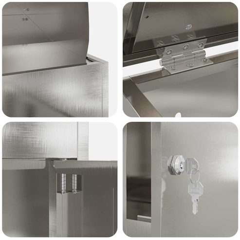 Diese Outdoor-Paketbox wurde entworfen, um Sicherheit und Ästhetik für deine Postsammlung zu erhöhen. Mit einem schlanken und modernen Design ist sie für den Außenbereich gebaut und fügt sich nahtlos in jeden Garten oder jede Terrasse ein. Ideal für Pakete und Briefe bietet diese Paketbox eine sichere Lösung für Hausbesitzer, die sowohl Funktionalität als auch Stil schätzen. Ihre wasserabweisende Stahlkonstruktion sorgt für Haltbarkeit gegenüber Witterungseinflüssen und bietet in jeder Saison Ruhe. Stahlkonstruktion: Diese Paketbox ist aus hochwertigem Stahl gefertigt und bietet sowohl Robustheit als auch Wetterbeständigkeit. Ihre moderne, rechteckige Form ist ideal, um Umwelteinflüssen standzuhalten und sicherzustellen, dass sie stabil bleibt und im Laufe der Zeit nicht rostet oder verfällt. Die Wahl von Stahl hebt nicht nur ihre Stärke, sondern verleiht auch ein modernes Erscheinungsbild, das jeden Außenbereich aufwertet. Einfacher Paketzugang: Die Box wurde für Praktikabilität entworfen und ermöglicht einen mühelosen Zugang zu Paketen. Der sanfte Abgabemechanismus sorgt dafür, dass Pakete sicher hineinrutschen, während die vorne abschließbare Tür einen einfachen Zugang für Hausbesitzer bietet. Dieses benutzerfreundliche Design spricht häufige Online-Shopper an und reduziert die Zeit für das Abholen von Paketen. Sicheres Schlossystem: Mit einem zuverlässigen Schlossmechanismus sichert diese Box deine Pakete effektiv und bietet Sicherheit gegen unbefugten Zugriff. Ideal, um deine Pakete zu schützen, bis du bereit bist, sie abzuholen, ist dieses Feature für diejenigen unerlässlich, die während der Lieferzeiten nicht zu Hause sind. Wetterbeständiges Design: Ausgestattet mit wasserabweisenden Eigenschaften widersteht diese Paketbox dem Regen und sorgt dafür, dass deine Pakete trocken bleiben. Das schützende Design bewahrt den Inhalt vor Feuchtigkeit und macht sie zu einer unverzichtbaren Ergänzung für Außenbereiche, die deine Investitionen sicher und intakt hält. Modernes Design: Mit schlanken Linien und minimalistischer Ornamentik fügt sich das Design harmonisch in Außenbereiche ein und verbessert die Gartenästhetik. Das klare Finish ergänzt zeitgemäße Landschaften und bietet einen ausgefallenen Look, der die Attraktivität erhöht, ohne die Funktionalität zu beeinträchtigen. ** Farbe: Schwarz ** Material: Edelstahl ** Beenden: Brushed ** Gesamtabmessungen: 44 x 35 x 59 cm (W x L x H) ** Innen- / außenbereich: Outdoor only ** Lieferung: ** 1 x Paketdrop-Box ** Anzahl der elemente: 1