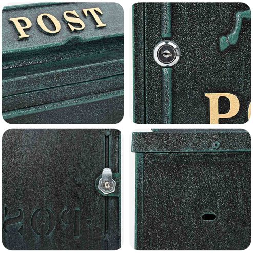 Dieser Vintage-Briefkasten zur Wandmontage verleiht jeder Außenanlage einen charmanten Touch und verbindet eine Ästhetik, die an vergangene Zeiten erinnert, mit moderner Funktionalität. Hergestellt aus strapazierfähigem Aluminium, sieht er auch bei schlechtem Wetter gut aus. Er ist nicht nur schön, sondern sorgt gleichzeitig dafür, dass Ihre Post sicher aufbewahrt wird. Langlebige Aluminiumkonstruktion Hergestellt aus hochwertigem Aluminium, widerstandsfähig gegen tägliche Abnutzung und hält allen Witterungen stand. Funktionalität und Sicherheit Mit einem sicheren Nockenschloss sorgt der Briefkasten dafür, dass Ihre Post immer sicher aufbewahrt ist. Zwei Schlüssel ermöglichen einfachen Zugang. Wetterfeste Eigenschaften Dieser Briefkasten wurde mit einem Regendach ausgestattet, das Ihre Post optimal vor widrigen Wetterbedingungen schützt. Es verleiht ihm gleichzeitig einen Vintage-Charme. Einfache installation Die Installation dieses wandmontierten Briefkastens ist einfach und erfordert lediglich einen Schraubendreher und zwei Personen für die Montage. Er fügt sich nahtlos in verschiedene Architekturstile ein und verleiht Ihrer Veranda oder Wand einen urigen und dennoch funktionalen Touch. Minimaler Pflegeaufwand Die Pflege dieses Briefkastens ist unkompliziert. Wischen Sie ihn einfach mit einem feuchten Tuch ab, um ihn zu reinigen und sein ästhetisches Erscheinungsbild zu erhalten. ** Farbe: Grün ** Material: Gussaluminium ** Gesamtmaße: 29 x 13 x 41 cm (L x B x H) ** Innenkastenmaße: 24,5 x 4,5 cm ** Türgröße: 26 x 32 cm ** Stil: Vintage ** Gewicht: 2,75 kg ** Wasserdichte Materialien ** Mit einem Regendach, abschließbar mit Schlüsseln ** Einfache Installation ** Rostfrei ** Korrosionsbeständig ** Nur für den Außenbereich ** Montage erforderlich: Ja ** Lieferumfang: ** 1 x Wandmontierte Briefkasten ** 2 x Schlüssel