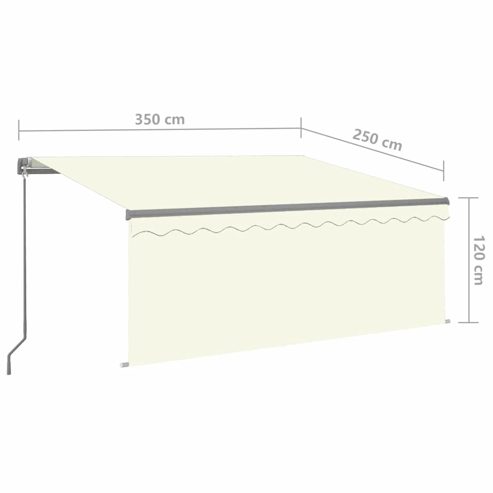 Schaffe einen angenehmen und kühlen Platz in deinem Außenbereich mit dieser einziehbaren Markise! Mit einem rostfreien, pulverbeschichteten Aluminiumrahmen ausgestattet, ist diese Outdoor-Markise leicht und dennoch robust. Der Markisenstoff besteht aus hochverdichtetem Polyester mit PU-Beschichtung, das UV- und wasserbeständig ist. Darüber hinaus können Winkel und Höhe an Ihre spezifischen Anforderungen angepasst werden. Mit der langen Handkurbel lässt sich die Markise sanft öffnen und einfahren. Zudem sorgen die solarbetriebenen LED-Leuchten nachts für energiesparende Beleuchtung. Die Jalousie schützt Sie vor UV-Strahlen und schafft Privatsphäre. ** Farbe: Creme ** Rahmenfarbe: Anthrazit ** Material: Pulverbeschichtetes Aluminium, 100% Polyestergewebe mit PU-Beschichtung ** Markisen-Größe: 3,5 x 2,5 m (B x H) ** Größe der Jalousie: 3,5 x 1,2 m (B x H) ** Benötigt: 3 x 3,7 V Batterie (nicht enthalten) ** Batteriekapazität: 2200 mAh ** LED-Leistung: 3 W ** LED-Spannung: 12 V ** Farbtemperatur LED: 3000 K ** Zusammenbau erforderlich: Ja Achtung! Starke Feder beim Öffnen! Entfernen Sie dieses Seil NICHT, bevor alle Montageschritte (mit allen Schrauben fest angezogen) abgeschlossen sind und der Gegenstand sicher an der Wand angebracht ist! Warnung! Vorsicht beim Lösen der Arme, da diese unter Spannung stehen! Ein plötzliches Lösen des Arms einer Gelenkarmmarkise kann zu Verletzungen führen. Warnung: Die Bedienungsanleitung muss vor der Verwendung des Produkts gelesen werden. Warnung: Der Betrieb unter frostigen Bedingungen kann das Produkt beschädigen. Verwendung im Außenbereich (an Gebäuden und bei Bauarbeiten).Kinder sollten beaufsichtigt werden, um sicherzustellen, dass sie nicht mit dem Gerät spielen. Halte Kinder vom Montagebereich fern. Achtung! Lies die Anleitung vor dem Gebrauch sorgfältig durch und bewahre sie zum Nachschlagen auf. GPSR