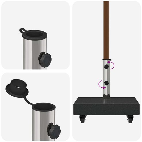 Diese Wägen Parasol-Basis verbindet Stärke und Stil. Perfekt für dein Outdoor-Setup im Sommer. Mit ihrer rechteckigen Form und dem modernen Design passt sie super in Gärten und auf Terrassen und erfüllt alle praktischen sowie ästhetischen Ansprüche. Sie ist dazu gemacht, deinen Sonnenschirm zu stützen und sieht gleichzeitig toll aus. Materialien: Hergestellt aus poliertem Granit und solidem Stahl, ist diese Basis robust und macht auch optisch was her. Diese Materialien sorgen dafür, dass sie lange bleibt und stabil ist, egal bei welchem Wetter. Eingeschlossene Komponenten: Mit verriegelbaren Rädern kannst du die Parasol-Basis ganz einfach bewegen und an die Sonne anpassen. Die Räder rollen problemlos auf unterschiedlichen Oberflächen. Funktionen / Design: Speziell für draußen gestaltet, meistert sie das Wetter ohne Probleme. Diese Basis gibt dir im Garten den nötigen Schatten und hat ein modernes Design, das perfekt zu deiner Außendeko passt. Empfohlene Verwendung: Perfekt für Gärten und Terrassen – ideal für Sommerpartys und entspannte Plätze. Du kannst sie flexibel positionieren und so tolle Plätze in der Sonne schaffen. Pflege & Wartung: Um sie schick zu halten, nutze eine Abdeckung, wenn sie nicht gebraucht wird, um sie vor Staub und Wetter zu schützen. Ein kleines bisschen Pflege sorgt dafür, dass sie immer in einem tollen Zustand bleibt und bereit für deine Outdoor-Abenteuer ist. ** Farbe: Schwarz ** Material: Granit, stahl ** Gesamtabmessungen: 45 x 25 x 45 cm (L x B x H) ** Gewicht: 25 kg ** Innen- / außenbereich: Nur für draußen ** Lieferung: ** 1 x Parasol-Basis ** Anzahl der elemente: 1 ** Versammlung erforderlich: Ja
