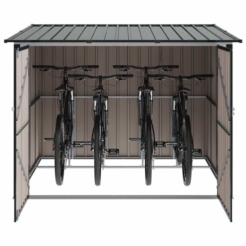 Mit den Maßen von etwa 215 x 206 x 157 cm verbindet dieser moderne Fahrradschuppen Stil und Funktionalität. Er fügt sich ganz leicht in jeden Garten oder auf jede Terrasse ein und ist perfekt, um Platz zu sparen und gleichzeitig gut auszusehen. Robuste Metallkonstruktion Der Schuppen ist aus hochwertigem Metall und bietet starken Schutz gegen Wettereinflüsse. Sein schlankes, modernes Design sieht nicht nur gut aus, sondern ist auch praktisch und fügt sich nahtlos in deinen Garten ein. Damit bleiben deine Fahrräder und andere wichtige Sachen immer gut geschützt. Funktionaler Zugang Mit doppelt verankerten Türen hast du einfach Zugang, um Fahrräder oder andere Dinge rein- und rauszuholen. Die breiten Türen passen für verschiedene Fahrradgrößen und machen die Nutzung einfach und bequem. Dieses durchdachte Design sorgt für einen effizienten Platzverbrauch. Erweiterte Sicherheit Ein zuverlässiges Vorhängeschloss hält deine Besitztümer sicher und schützt vor unerwünschtem Zugriff. Damit sind deine Fahrräder und gelagerten Sachen immer gut aufgehoben. Das einfache Schloss vereint traditionelle Sicherheit mit modernen Anforderungen. Strategisches Raumdesign Mit seinen Abmessungen von 215 x 206 x 157 cm nutzt der Fahrradschuppen den Platz optimal aus. Er bietet Raum für mehrere Fahrräder und bleibt dabei ordentlich. Durchdacht gestaltet, nutzt du deinen Außenbereich effektiv, ohne auf Stil oder Lagerkapazität verzichten zu müssen. Montage & Pflege Du brauchst zwei Personen und einen Schraubendreher für die Montage, um sicherzustellen, dass alles stabil und korrekt aufgebaut ist. Wenn du die Anleitung des Herstellers befolgst, läuft alles reibungslos. Für die Pflege gehören regelmäßige Überprüfungen und das Trocknen mit einem Tuch dazu, damit der Schuppen schön aussieht und lange hält. ** Farbe: Anthrazit ** Material: Metall ** Gesamtabmessungen: 215 x 206 x 157 cm (L x B x H) ** Langlebig ** Montage erforderlich: Ja