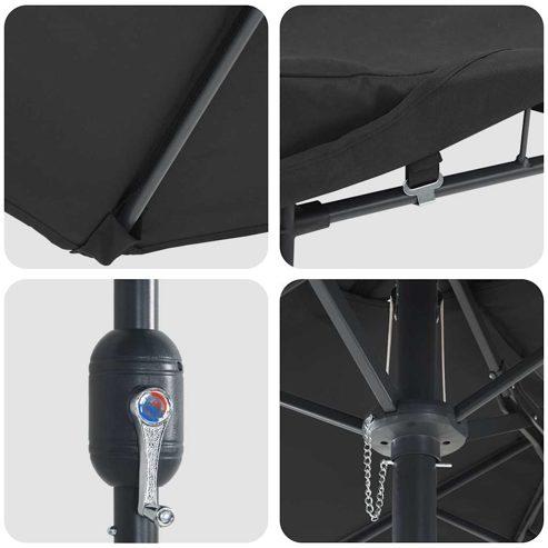 Dieser Gartenparasol ist das perfekte Accessoire für den Außenbereich, um einen schattigen und entspannten Raum in deinem Garten, auf der Terrasse oder in anderen offenen Bereichen zu schaffen. Er ist im modernen Stil mit klaren, einfachen Linien gestaltet und fügt sich nahtlos in verschiedene Außeneinstellungen ein, einschließlich Balkonen, Gärten und Terrassen. Dieser Sonnenschirm bietet sowohl Stil als auch Funktionalität, mit einem Doppelschirm-System, das umfassenden Schutz vor direkter Sonneneinstrahlung bietet. Die glatte Textur des Polyesterstoffs sorgt für ein elegantes Aussehen und verbessert die Gesamtästhetik jeder Außeneinstellung. Modernes Design: Gezeichnet durch klare Linien und minimale Verzierungen ergänzt der Gartenparasol zeitgenössische Außenbereiche. Sein poliertes Aussehen verbessert nicht nur die visuelle Anziehungskraft, sondern passt auch gut zu anderen modernen Außenmöbeln, die eine stimmige Außenumgebung schaffen. Doppelschirm: Das Design bietet erweiterten Schutz und sorgt für mehr Schatten als ein standardmäßiger Sonnenschirm. Dieses Merkmal ist besonders nützlich, um Sitz- oder Essbereiche an sonnigen Tagen zu schützen und für Komfort und Nutzbarkeit während heißer Sommer zu sorgen. Praktische Handkurbel: Eine manuelle Handkurbel ist integriert, um einfaches Öffnen und Schließen zu ermöglichen. Diese Funktion sorgt dafür, dass Nutzer die Position des Schirms schnell anpassen können, um den Schatten zu optimieren und den Aufwand für den Aufbau zu minimieren. Zusammenklappbares Design: Der Parasol lässt sich glatt zusammenfalten, was eine kompakte Lagerung ermöglicht. Ob beim Einlagern des Schirms am Ende des Tages oder während der Nebensaison, seine Zusammenklappbarkeit stellt sicher, dass er minimalen Platz beansprucht, was ihn praktisch für Haushalte mit begrenztem Stauraum macht. UV-Schutz und Wasserbeständigkeit: Aus Polyester gefertigt, bietet der Parasol UV-Schutz, um vor schädlichen Sonnenstrahlen zu schützen. Er ist zudem wasserabweisend für zusätzliche Haltbarkeit bei unerwarteten Regenschauern und sorgt so für eine zuverlässige Nutzung auf lange Sicht. ** Farbe: Schwarz ** Material: Stoff ** Gesamtabmessungen: 385 x 209 x 244 cm (L x B x H) ** Zusammenklappbar ** Doppelt kopfiger Sonnenschirm mit Kurbel ** Versammlung erforderlich: Ja ** Lieferung: ** 1 x Gartenparasol Das Produkt enthält Kleinteile, die für Kleinkinder eine Gefahr darstellen können. Kleinteile außerhalb der Reichweite von Kindern aufbewahren. Dieses Produkt ist kein Spielzeug! Achte darauf, dass Kinder weder den Sonnenschirm.