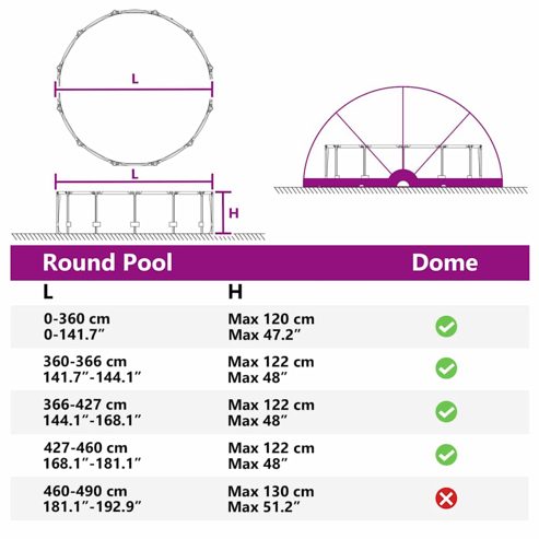 Dieser praktische faltbare Pool-Dom ist der perfekte Begleiter für deine Pool-Sessions im Freien und bringt sowohl Schutz als auch Komfort. Ideal für moderne Gärten, hat der Dome ein elegantes, minimalistisches Design, das sich gut in jede Umgebung einfügt. Seine glatte Oberfläche macht ihn einladend und sorgt für eine stressfreie Poolumgebung. Mit seinen cleveren Faltfähigkeiten ist er ein absolutes Must-Have für die Pflege und den Schutz deines Pools, was ihn noch attraktiver macht. Robuste Materialien: Aus UV-beständigem Glasfaser und wasserfesten Technologien – dieser Dome schützt deinen Pool vor Sonnenstrahlen und schlechtem Wetter. Seine starke Bauweise sorgt dafür, dass er lange hält und dein Poolbereich immer sauber bleibt, mit minimalem Aufwand. Umfassende Komponenten: Der Pool-Dome kommt mit allem, was du brauchst: einem kompletten Set flexibler Glasfaserstangen, einer praktischen Tragetasche und stabilen Abspannleinen. So bist du bestens gerüstet für eine einfache Montage und extra Sicherheit bei Wind. Funktionale Merkmale: Einfach zusammenfalten und entfalten! Das geht ganz unkompliziert ohne Maschinen. So kannst du den Wärmeverlust zwischen den Nutzungen vermindern und die Energieeffizienz steigern. Saisonale Vielseitigkeit: Perfekt für den Sommer und beim Camping – dieser Dome passt super in Gärten und auf Terrassen und fügt sich problemlos in verschiedene Umgebungen ein. Er lässt sich kompakt lagern und ist ideal für Abenteuer und Entspannung. Wartungsfrei: Speziell für den Outdoor-Gebrauch gemacht, braucht dieser Pool-Dome fast keine Wartung. Einfach vermeiden, ihn bei starkem Wind oder Regen zu nutzen, damit er in gutem Zustand bleibt für viele schöne Tage und sorgloses Vergnügen. ** Farbe: Transparent ** Material: PVC ** Gesamtabmessungen: 546 x 516 x 250 cm (L x B x H) ** Gewicht: 14,35 kg ** Faltbar ** Wasserfeste Materialien ** UV-beständige Materialien ** Blockiert Blätter und Schmutz ** Einfach zu öffnen und zu schließen ** Reduziert Wärmeverlust ** Schneller Abbau für kompakte Lagerung ** Abspannleinen für zusätzliche Festigkeit ** Erdanker für zusätzliche Stabilität ** Tragetasche für einfachen Transport ** Flexible Fiberglasstangen ** Innen- / Außenbereich: Nur für den Außenbereich ** Lieferumfang: ** 1 x Zehn ** 1 x Set von Stangen ** 8 x Abspannleine ** 12 x Erdnagel ** 1 x Tragetasche ** Montage erforderlich: Ja Achtung Halten Sie alle Flammen und Wärmequellen von diesem Produktgewebe fern.