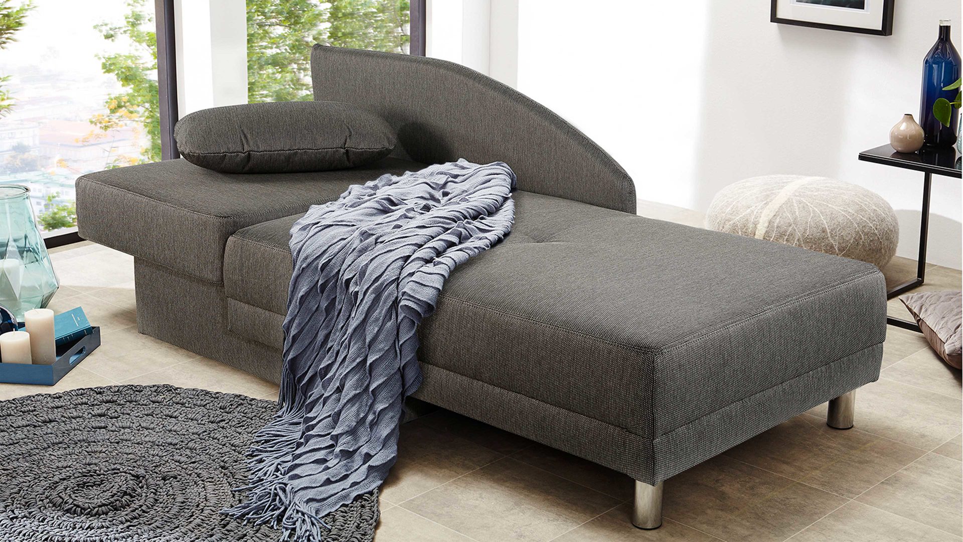 Als funktionale Highlights fungieren der stoffbezogene Rücken und vor allem die Federkernpolsterung - sie sorgt für den hohen Sitzkomfort, den Sie auf dem Sofa genießen. Die Rückenlehne der Couch ist umklappbar, sodass Sie die Recamiere im Handumdrehen zu einem gemütlichen Gästebett mit einer Liegefläche von ca. 84 x 200 cm (BxL) umfunktionieren können - ideal, wenn Verwandte, Freunde oder Bekannte bei Ihnen nächtigen möchten. Auch ein Bettkasten ist in das Sofa integriert, sodass es Stauraum für Decken, Kissen oder sonstige Utensilien offeriert. Sie erhalten das Funktionssofa mit einem losen Rückenkissen sowie einem Zierkissen.