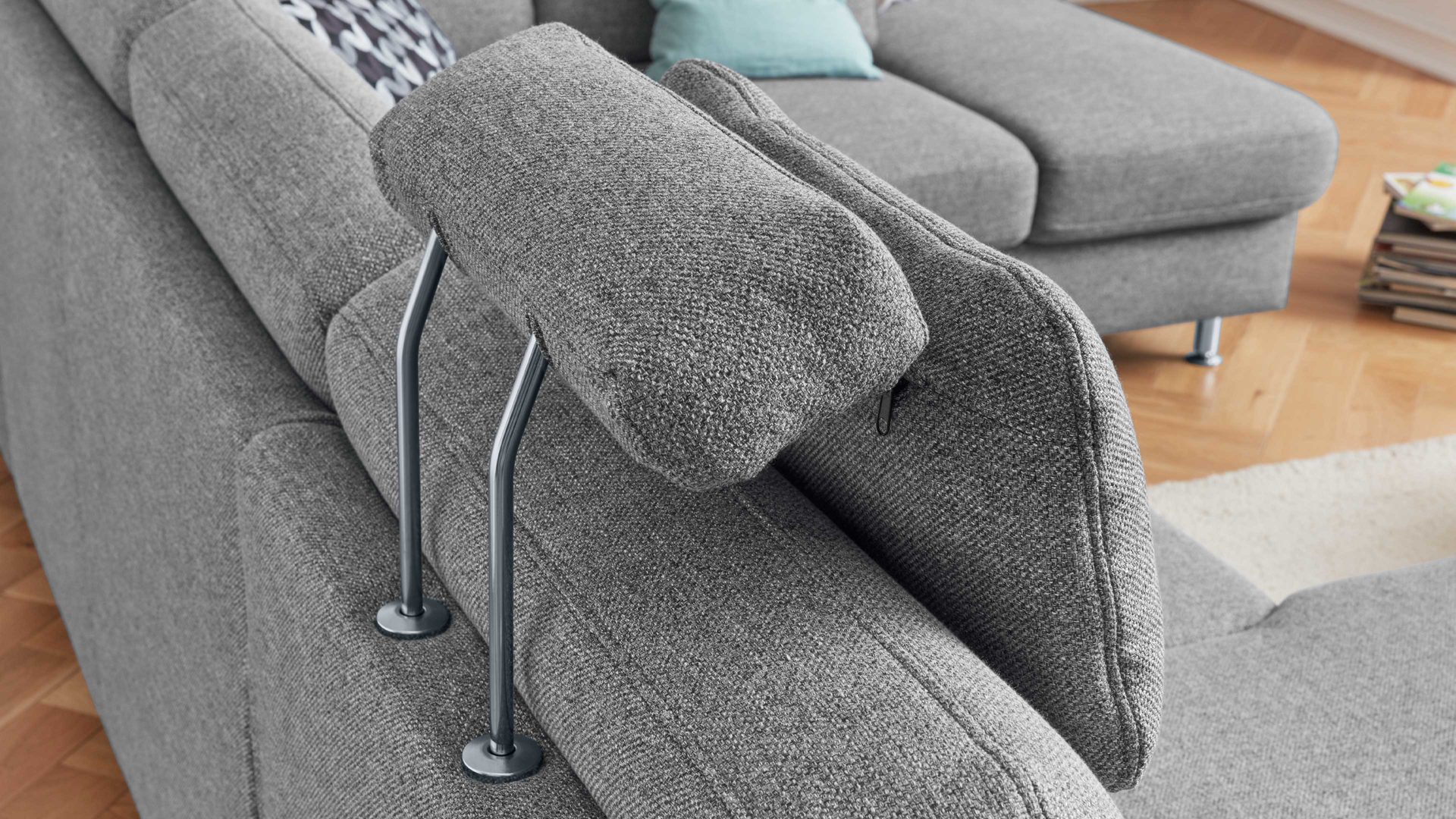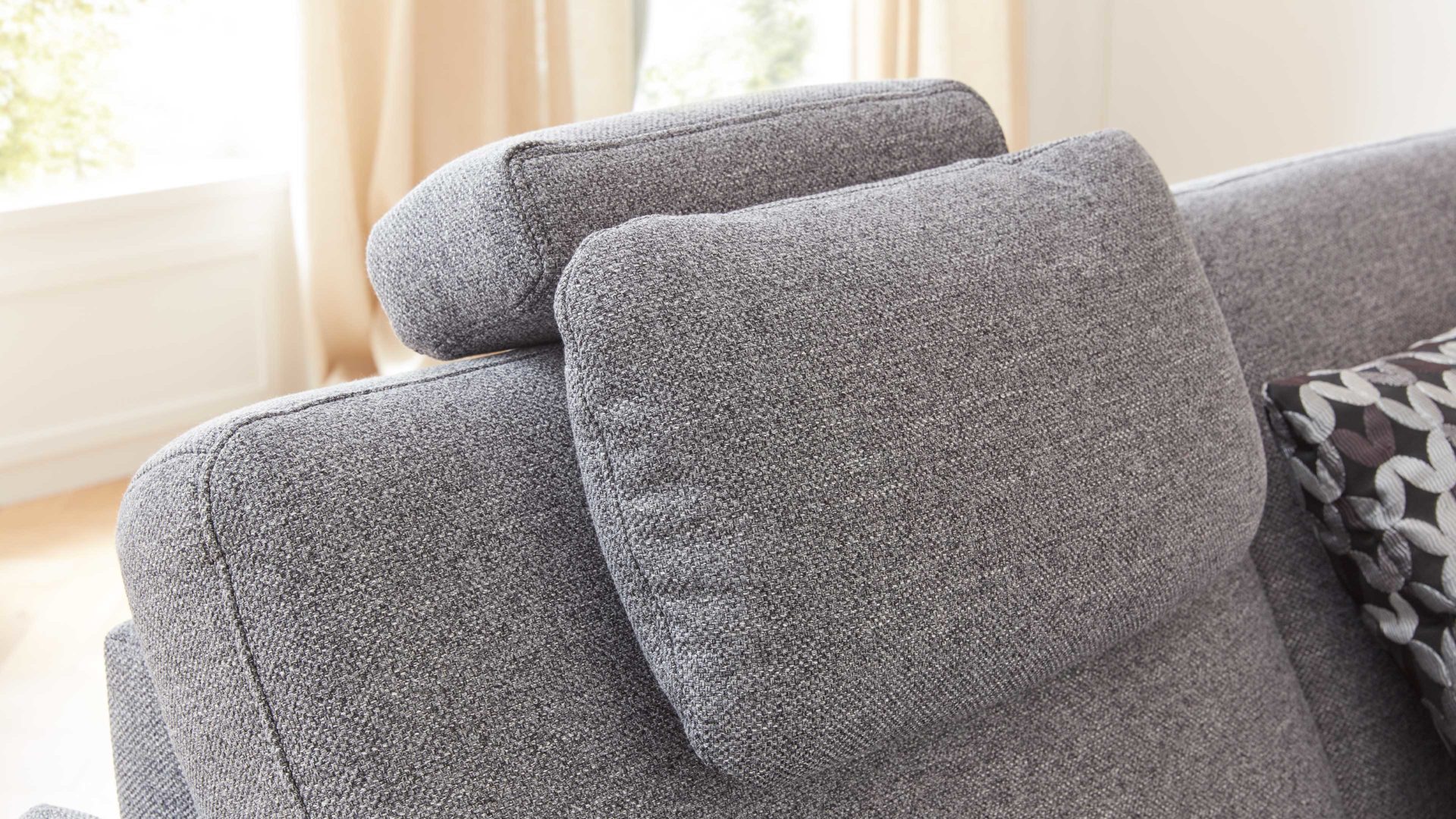 Die Premium-Kopfstütze PKS ist passend zur Eckkombination mit stahlgrauem Flachgewebe bezogen.