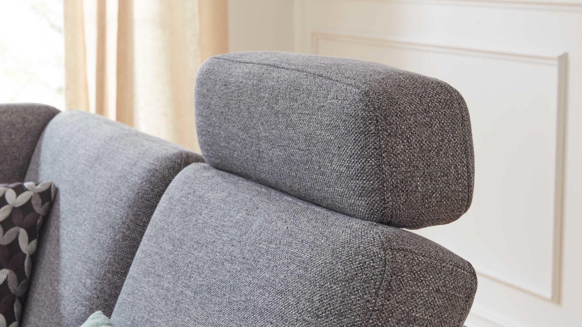 Die Kopfstütze KS ist passend zur Eckkombination mit stahlgrauem Flachgewebe bezogen.