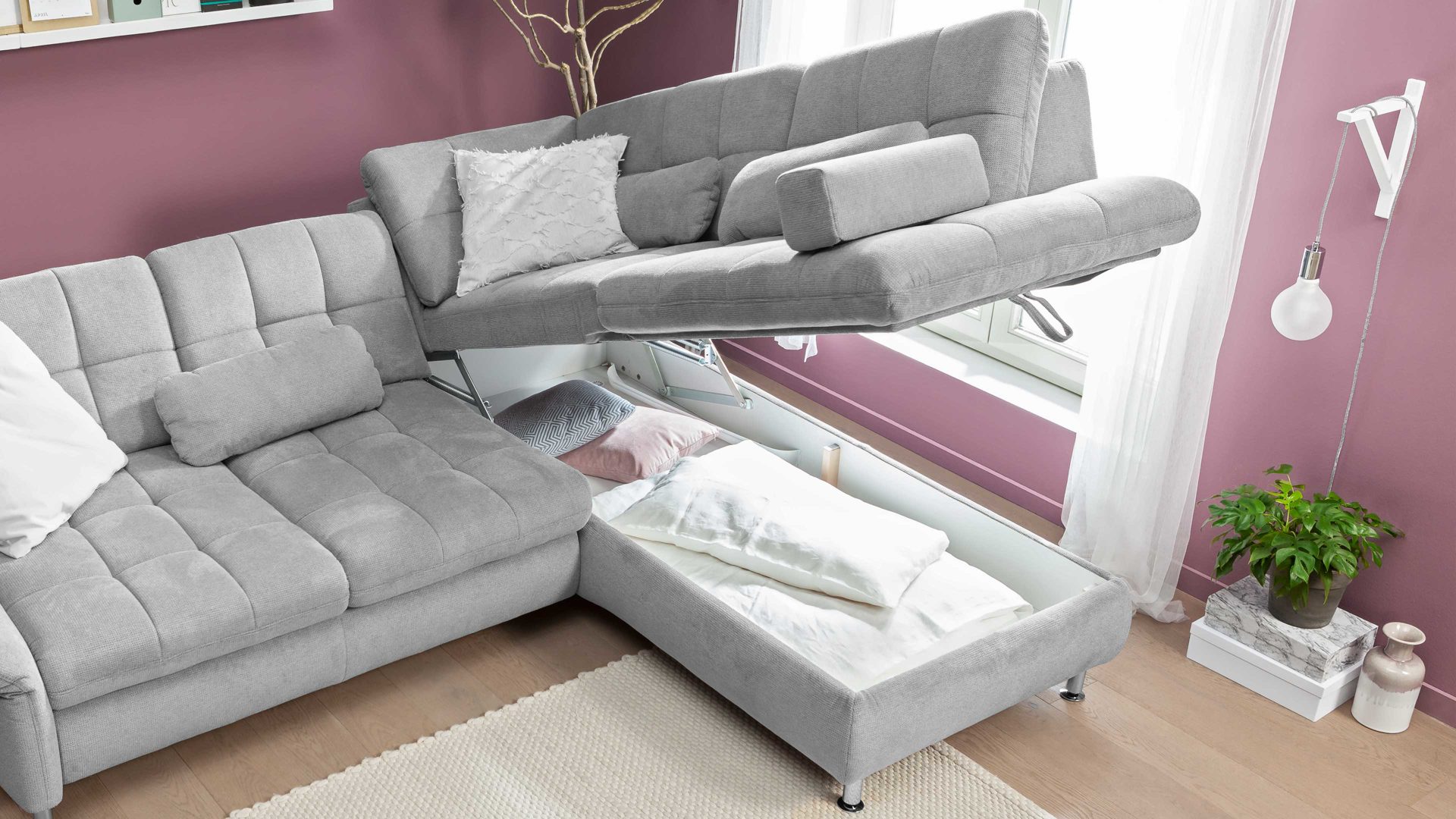 Es verbindet den hellen, stahlfarbenen Mikro-Chenillebezug Belle mit verchromten Metallfüßen für stabilen Stand. Die Federkernpolsterung im Sitz sorgt für hohen, festen Sitzkomfort. In der Rückenlehne gewährleistet die weiche Kaltschaumpolsterung bequemes Anlehnen. Demnach schafft die qualitativ erstklassige Eckkombination beste Voraussetzungen für viele entspannende Momente mit der Familie.