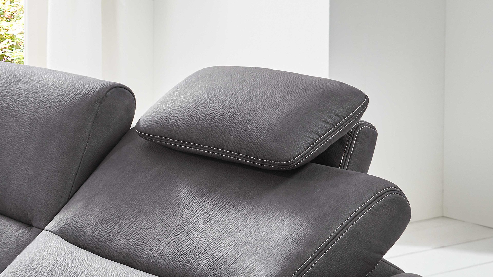 Die Premium-Kopfstütze PKS fungiert als Mehrpreis-Zubehör für die Sofas mit grauem Mikrofaserbezug aus dem Modulmaster Programm MM-ZE1049.
