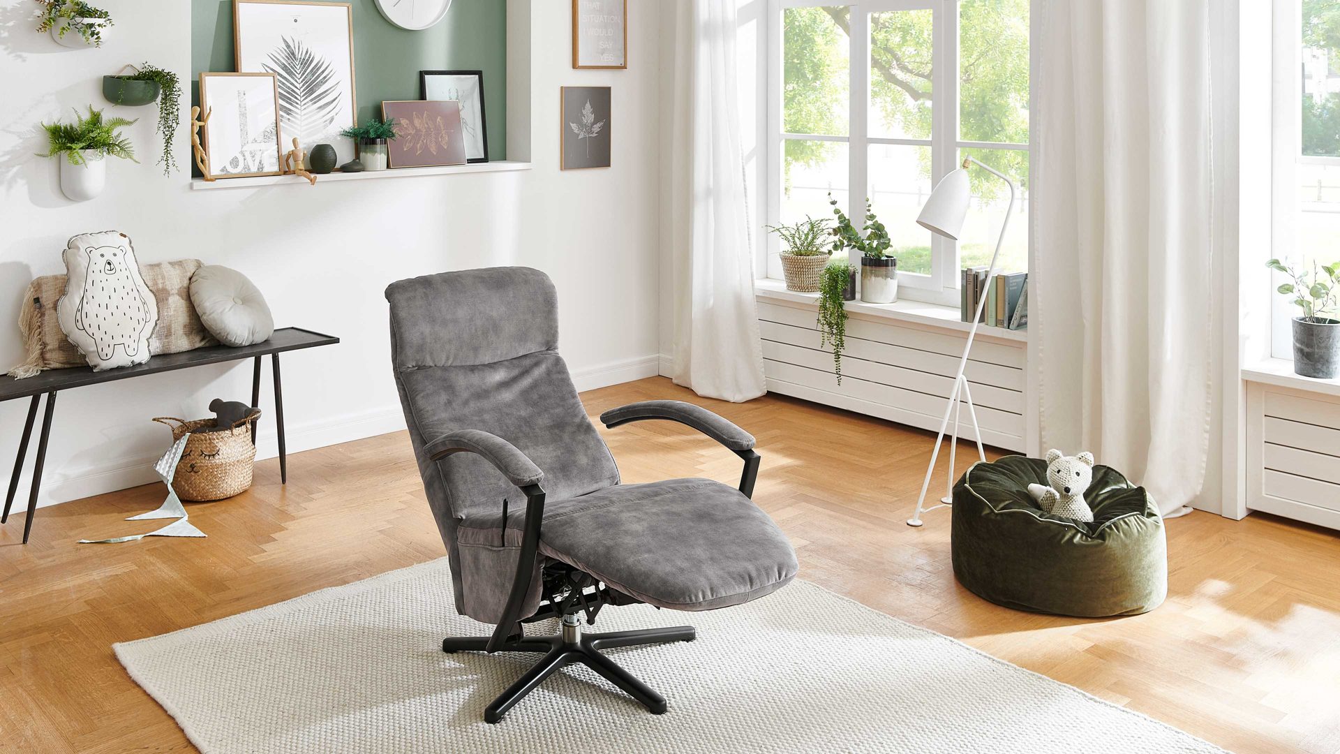 Indem Sie leichten Körperdruck ausüben, senken Sie den Rücken. In der Folge geht der Sitz automatisch nach vorn und oben. Gleichzeitig fährt die Beinauflage nach oben, bis die entspannende Relaxposition erreicht ist. Zu den funktionalen Höhepunkten gehört überdies die stufenlose Kopfpolsterverstellung. Zudem ist der Fernsehsessel um 360 Grad drehbar.
