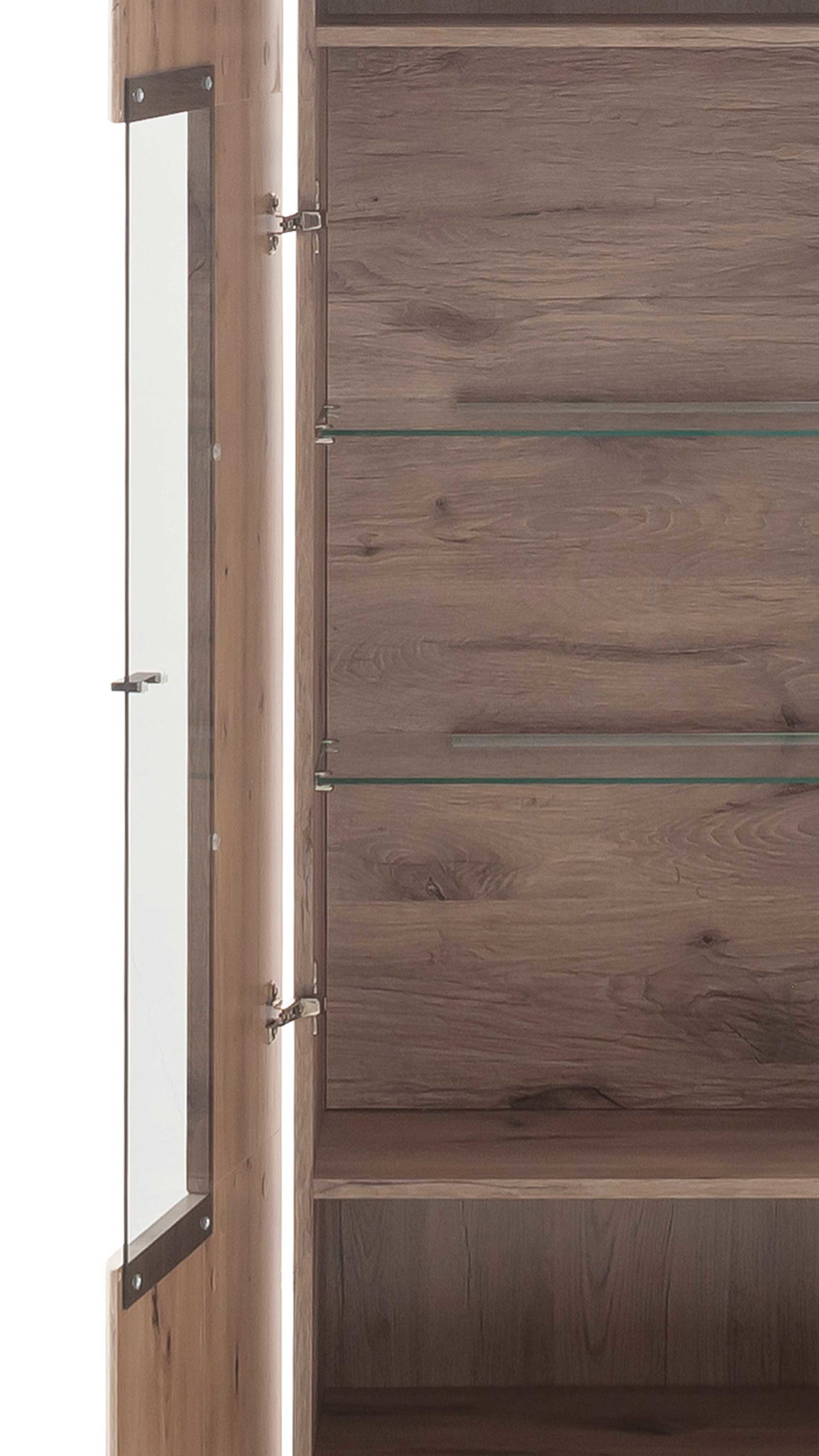 - Die Vitrine PTO3AT10 misst ca. 60 x 199 x 37 cm (BxHxT) und beherbergt hinter der Tür zwei Klarglas- und vier Holzeinlegeböden.