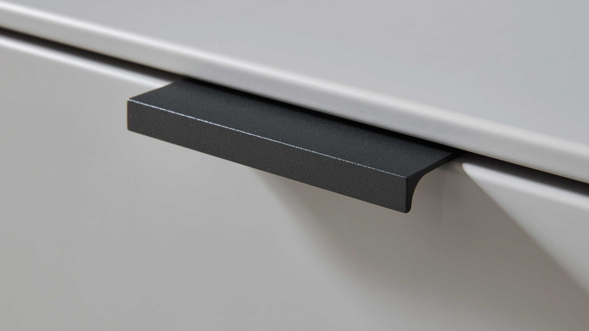 samtgraue Mattlackoberflächen, kombiniert mit stark gebürsteter Balkeneiche und carbonfarben pulverbeschichtete Metallgriffen