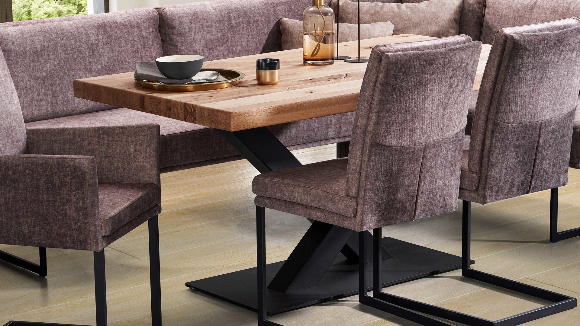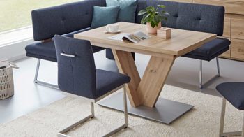 • Die Abbildung zeigt ein Wohnbeispiel, welches auch Dekoration sowie separat erhältliches Zubehör enthält. Im Lieferumfang enthalten ist ein Esstisch mit Balkeneiche-Massivholzplatte.