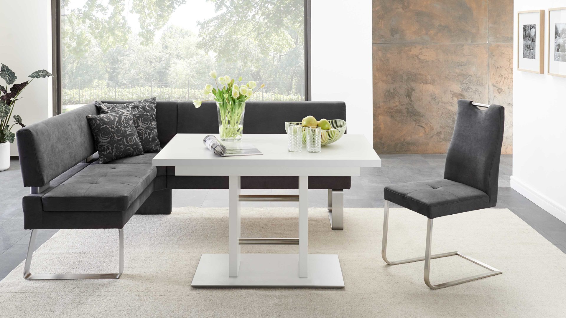 • Die Abbildung zeigt ein Wohnbeispiel, welches auch Dekoration sowie separat erhältliches Zubehör enthält. Im Lieferumfang enthalten ist die Eckbank Gino.