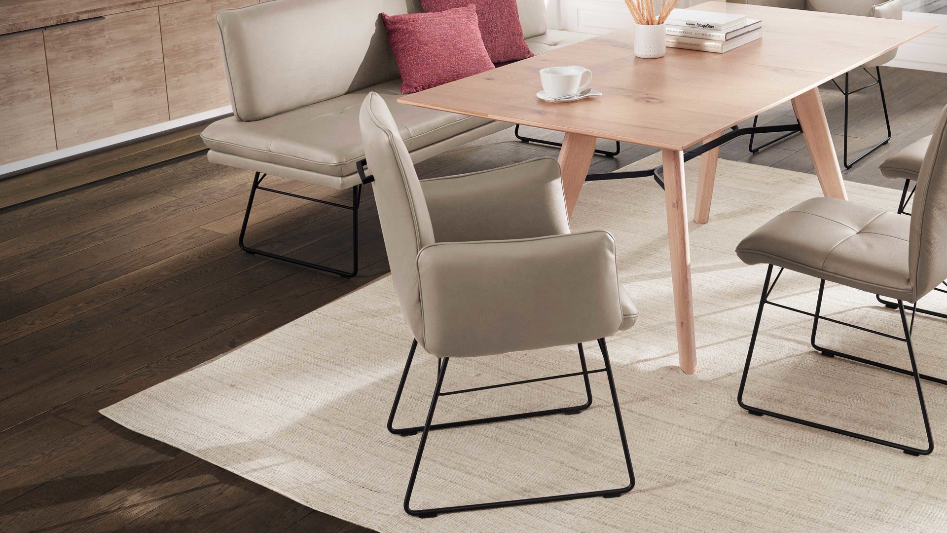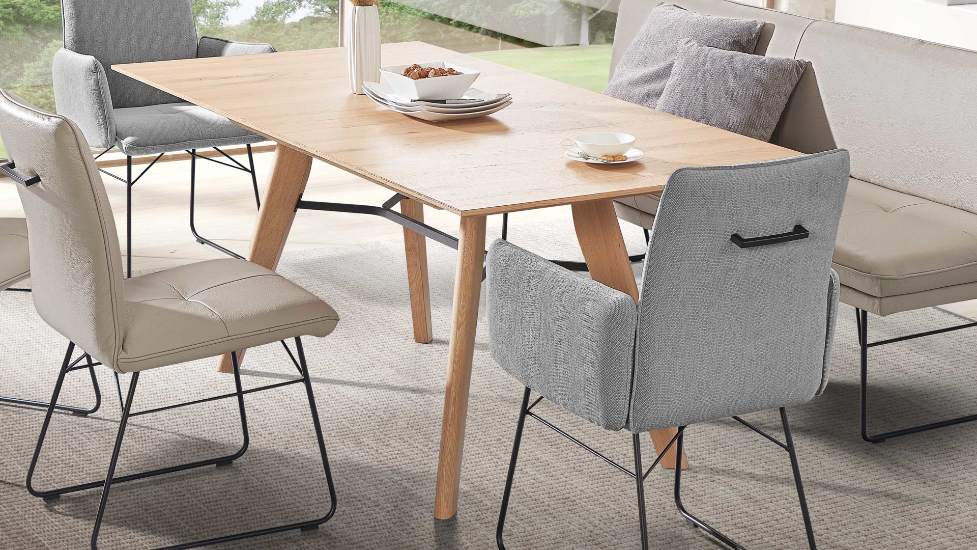 • Die Abbildung zeigt ein Wohnbeispiel, welches auch Dekoration sowie separat erhältliches Zubehör enthält. Im Lieferumfang enthalten ist ein Esstisch mit Balkeneiche-Massivholzplatte.